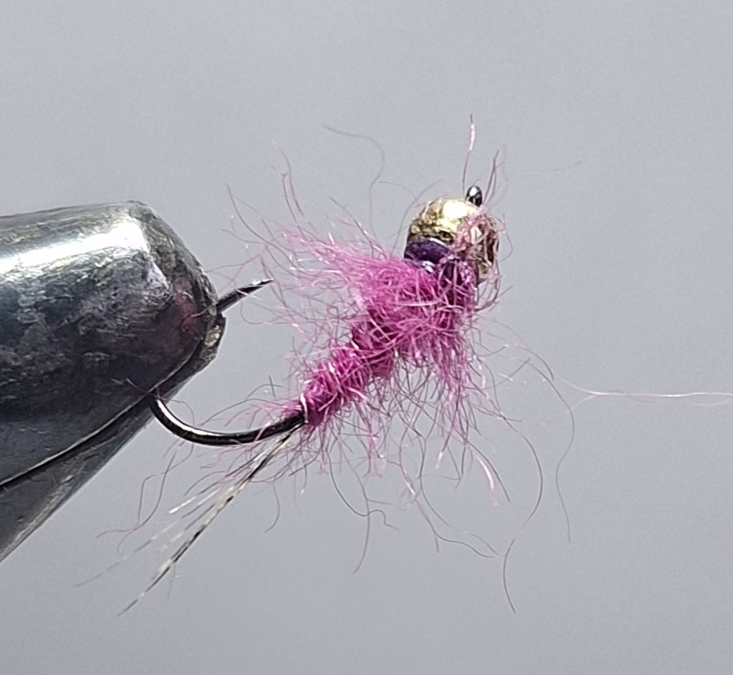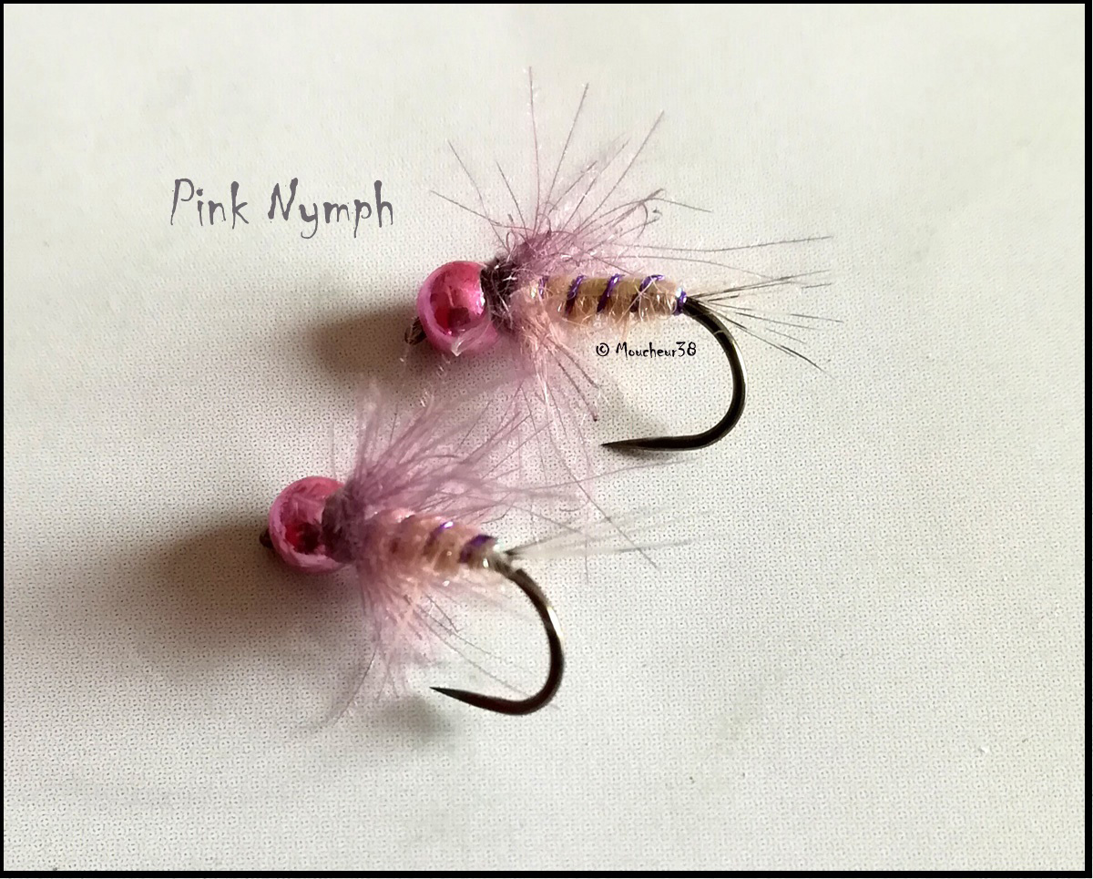 Hameçon : # 14 tige droite – Tête : bille tungstène rose métallique 2,8 mm – Cerques : fibres de coq de Leon – Dos : film plastique zinc – Corps : dubbing d’antron rose crevette – Cerclage : fil iridescent violet – Collerette : Cdc mauve