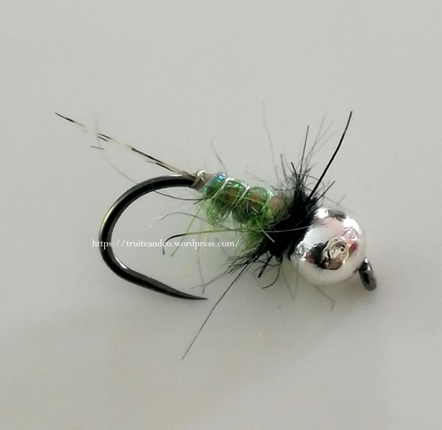 Hameçon : 10/12/14/16 – Tête : bille tungstène : de 2,2 à 3,8 m/m – Cerques : coq Pardo ou Limousin – Carapace : Mylar opalescent – Cerclage : Fil de cuivre argent – Corps : dubbing vert : Hare Ear plus Devaux – Collerette : Dubbing de lièvre noir.