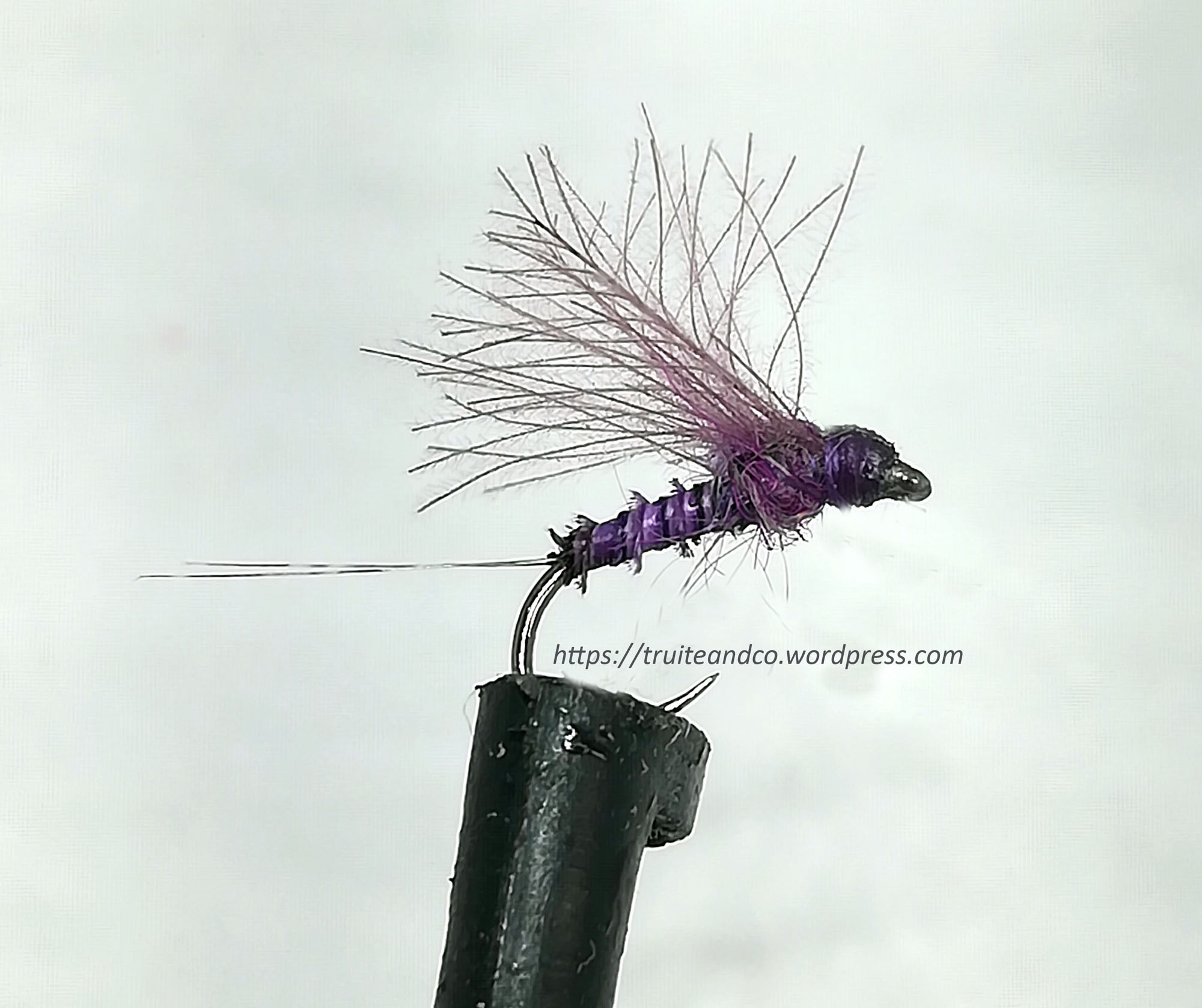 Matériaux de montage : Hameçon : du n°14 Bl à n°18 – Corps : substitut de condor teint en mauve – Thorax : dubbing mauve cdc – Ailes : cdc mauve ou violet – Cerques : Coq Pardo (2)  – Tête : fil de montage –Fil de montage : 8/0 mauve