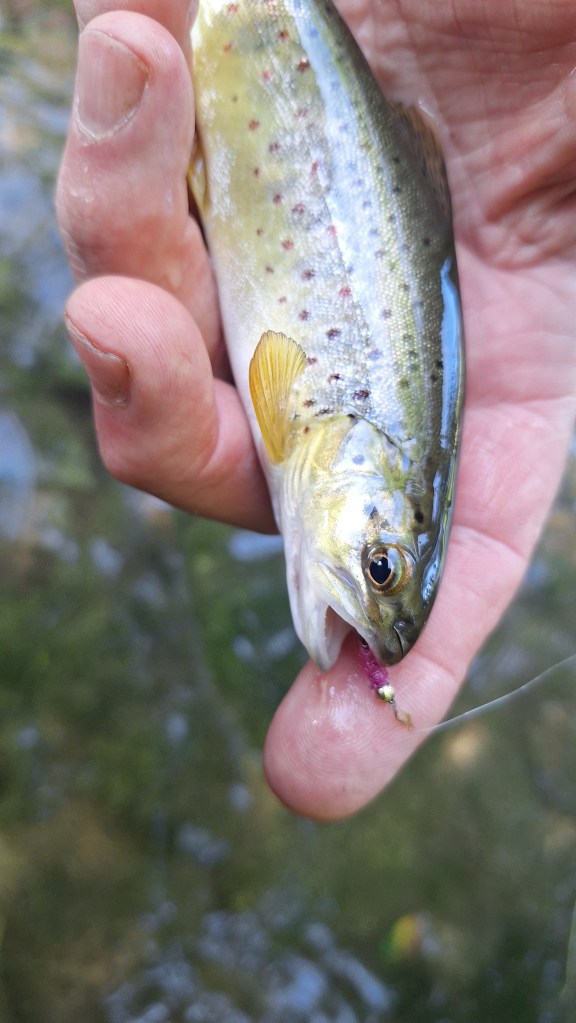 Me voilà les pieds dans l’eau, je commence à pêcher les petits courants le long des bordures qui se trouvent dans mon périmètre, une fenêtre vient de s’ouvrir, je suis dans les bonnes heures, les touches se succèdent, mon tabanas bien graissé fait monter pas mal de petites. J’ en rate pas mal et j’en dépique quelques-autres, ce sont des petites truites dont certaines sont âgées à peine d’une année, ce qui me laisse à penser que le frai fonctionne pas trop mal sur cette portion de rivière.