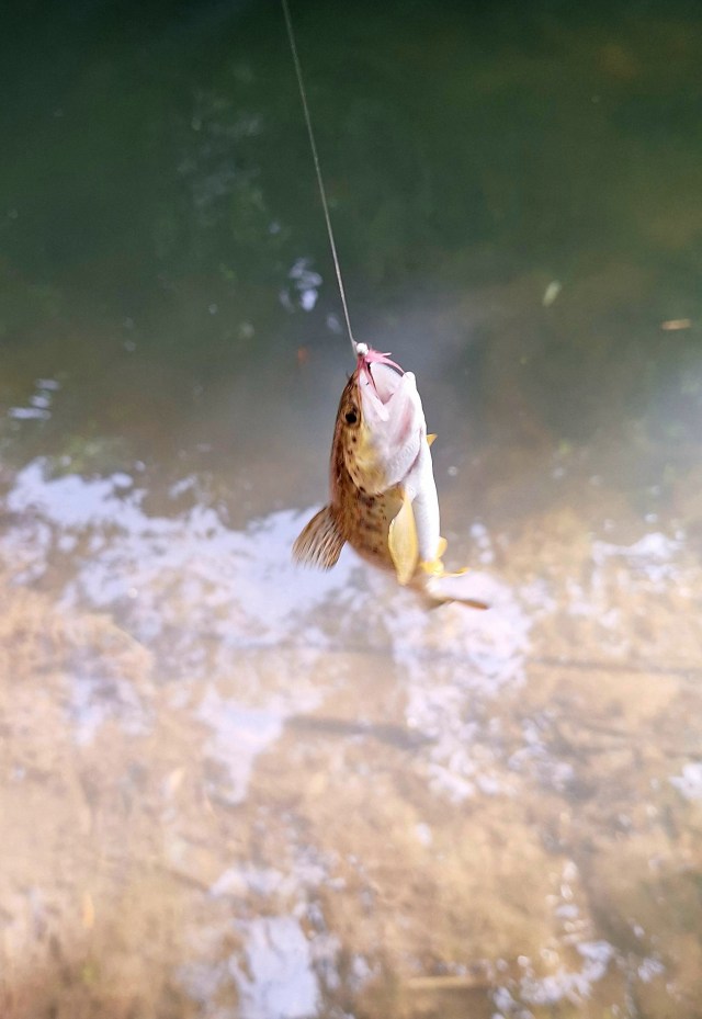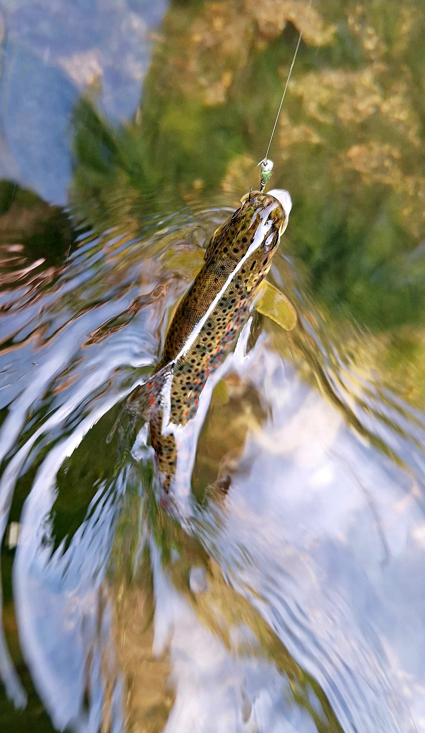 Je continue ma progression vers l’amont et j’arrive sur une zone de pêche avec beaucoup plus de courants, je décide donc de passer en nymphe. Pour cela, je vais devoir changer de bobine et mettre celui qu’avec le fil fluo bicolore, j’attache une nymphe bille de 3mm, ça passe pas trop mal, la preuve ce sera un peu plus joli, car je vais toucher trois truites pas trop vilaines de par la beauté de leur robe. Ce sont de belles bagarreuses, ne se laissant pas amener à l’épuisette aussi facilement et je suis en pointe en 12 centièmes, connaissant la ruse de ces truites, j’ai intérêt à brider rapidement les poissons afin qu’elles n’aillent pas se caler sous les gros blocs, j’ai souvent perdu de beaux poissons en ne le faisant pas.