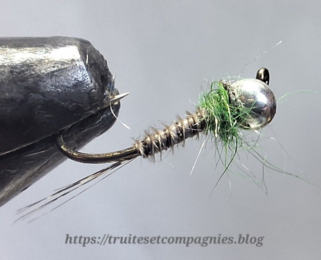 Hameçon : # 14 ou 16 tige droite – Tête : bille tungstène argent 2,8 mm – Cerques : pardo –  Abdomen : herl de vautour naturel ou substitut – Collerette : dubbing Hare Ear plus couleur verte .