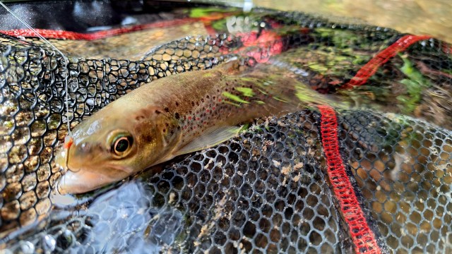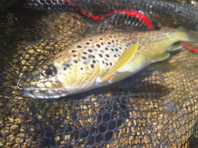 Je continue ma progression, j’arrive sur un autre spot ou habituellement les truites gobent souvent, mais cette fois, il n’y a pas d’activité en surface, peut-être est-il encore tôt. Je reste en nymphe et sur le courant du dessus, après un passage de la ligne au ralenti, je ressens une tape franche et rapide sur ma nymphe, puis je vois la truite se replacer sur le fond. Une jolie truite, certes moins grosse certes que la précédente, je vais changer de nymphe pour mieux atteindre le fond, je change de nymphe, je passe sur une bille tungstène de 3,5 mm je n’ai pas plus gros, mais cela suffira à passer à ras du fond, ce fût le bon choix, car je vois la truite se saisir de ma nymphe, elle n’est pas grosse, mais dotée de belles zébrures bien marquées, qui sonnera la fin des touches.