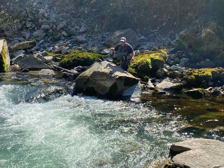 Sur la photo ci-dessous, le gros bloc rocheux est typique d’un bon poste à truites, votre mouche, doit longer la bordure le long du bloc, mais pas que, tout est à prospecter, ne soyez pas étonné si une belle truite vient prendre votre mouche.