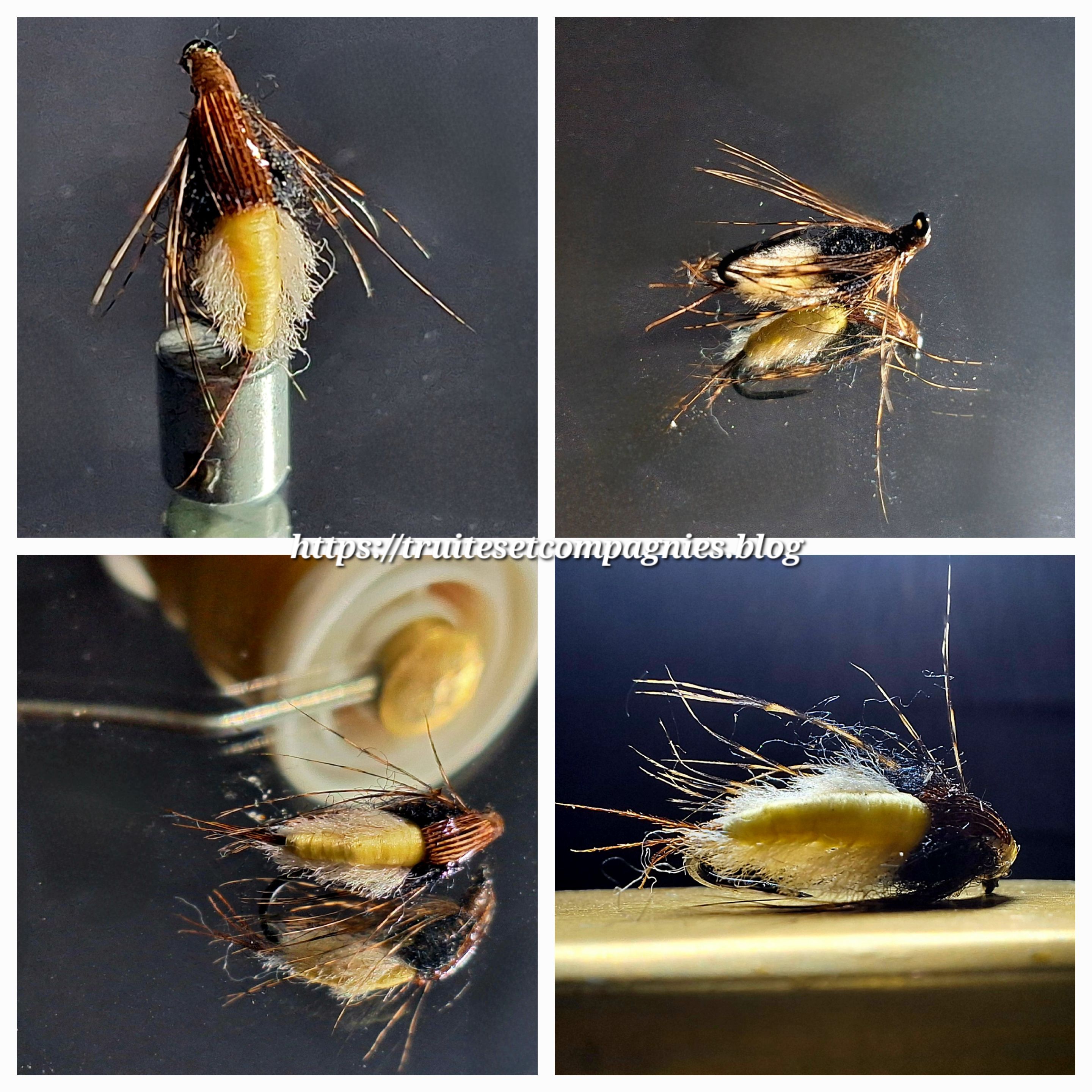Hameçon : caddis n°12 – Queue : 3 sabres de queue de faisan – Abdomen : floss jaune/crème – Branchies : Floss blanche – Sac alaire: sabres de faisan – Naissance des ailes : plumes de perdrix – Thorax : dubbing super fin noir – Fil de montage : Veevus 12/0 marron. Vous pouvez à l’aide d’un marqueur indélébile marron à pointe fine, tracer les annelures sur le dos, je ne l’ai volontairement pas fait.
