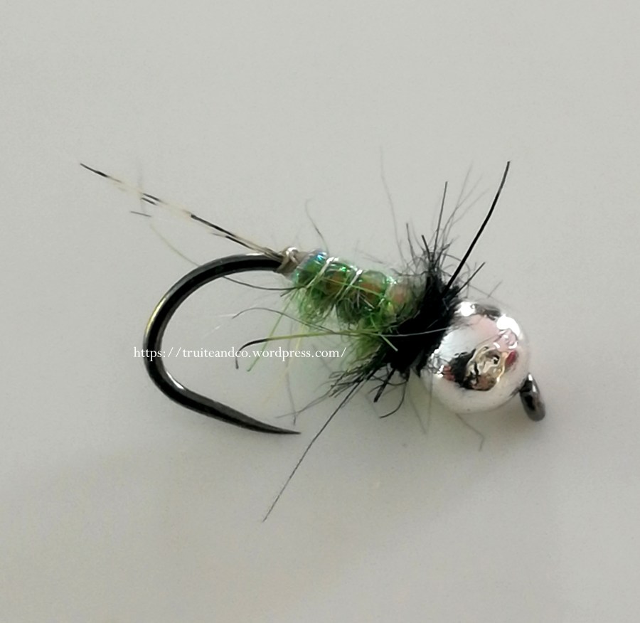 Hameçon : 10/12/14/16 – Bille tungstène : de 2,2 à 3,8 m/m – Cerques : coq Pardo ou Limousin – Carapace : Mylar opalescent – Cerclage : Fil de cuivre argent – Dubbing vert : Hare Ear plus Devaux – Collerette : Dubbing de lièvre noir.