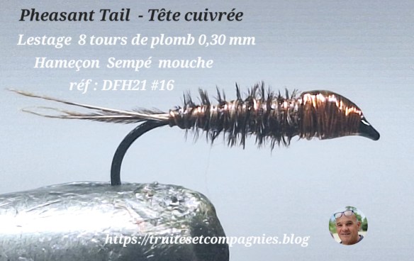 Hameçon : droit Sempé réf DFH21 #16 – Cerques et abdomen : sabres de faisan – Cerclage : fil de cuivre fin – Thorax et tête : fil de cuivre – Lestage : fil de plomb fin ou médium – Vernir à l’Uv ou vernis classique .
