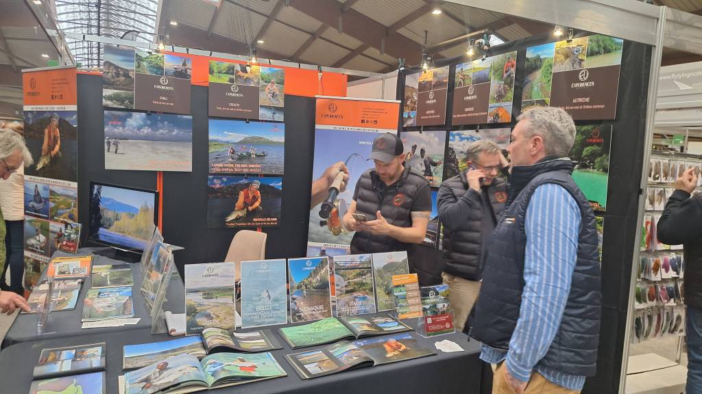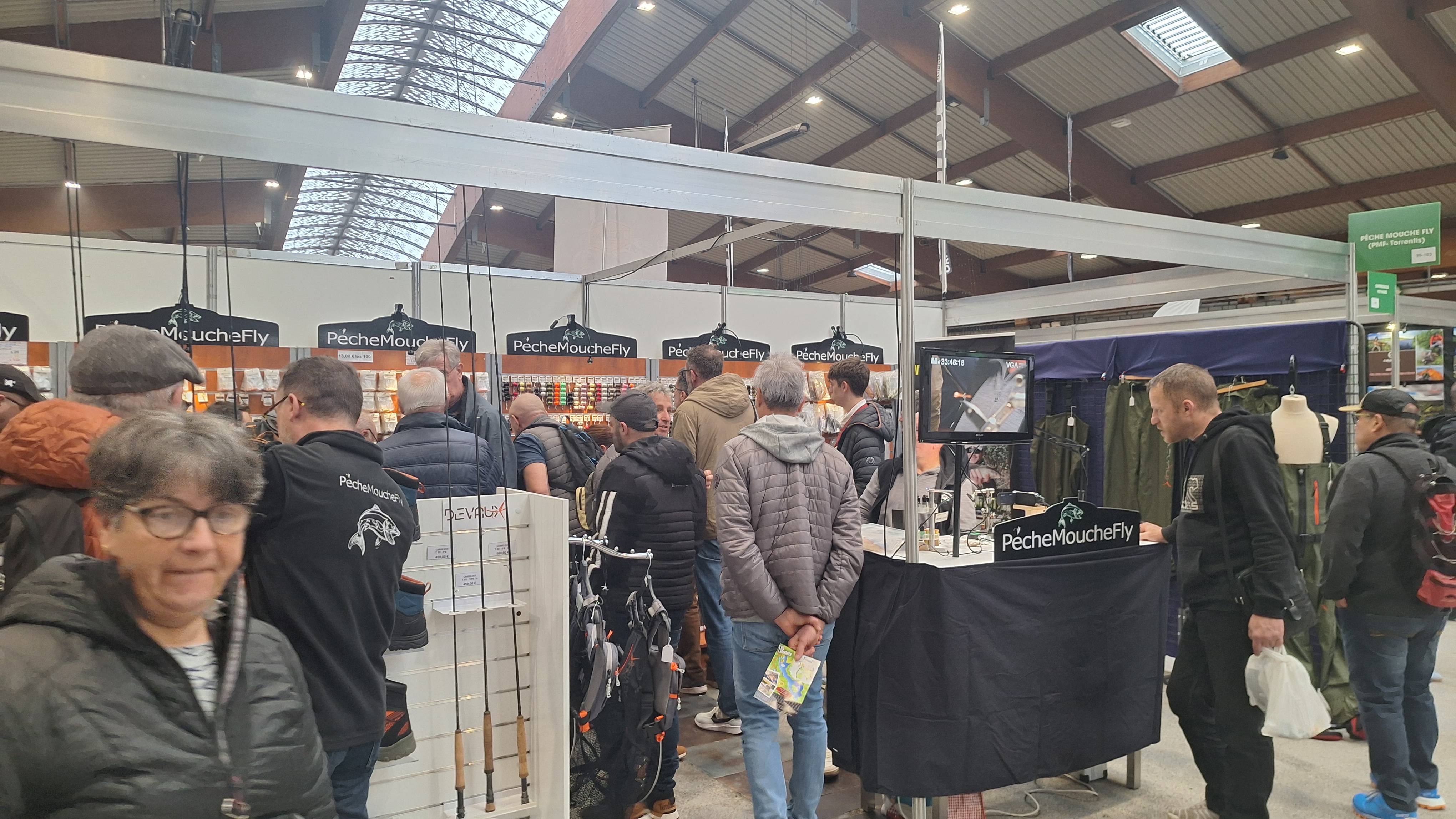 Nous sommes enfin à l’intérieur, sur notre gauche, beaucoup de stands d’exposants, de guides de pêche, de voyagistes, sans compter les stands de Fly Tiing.