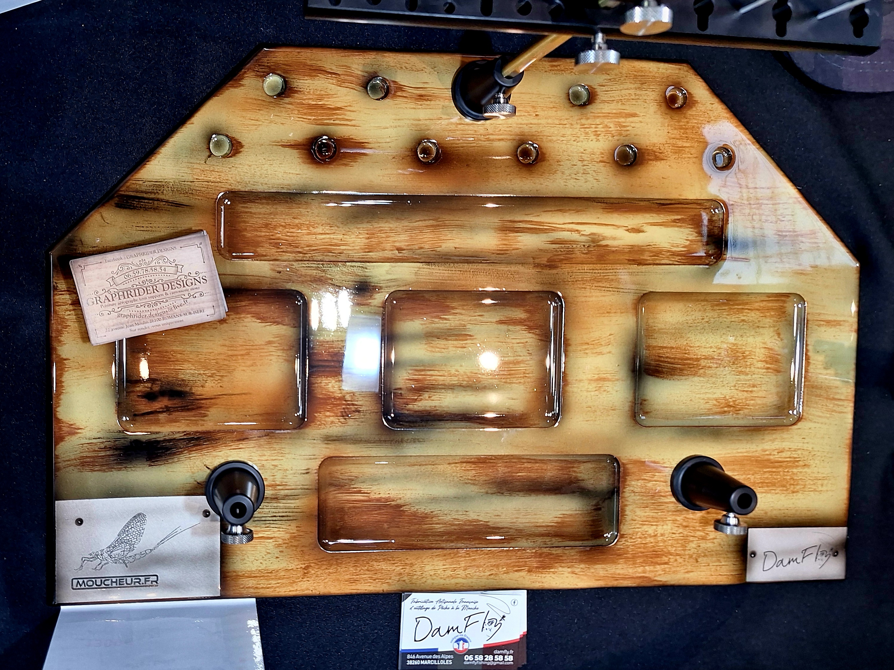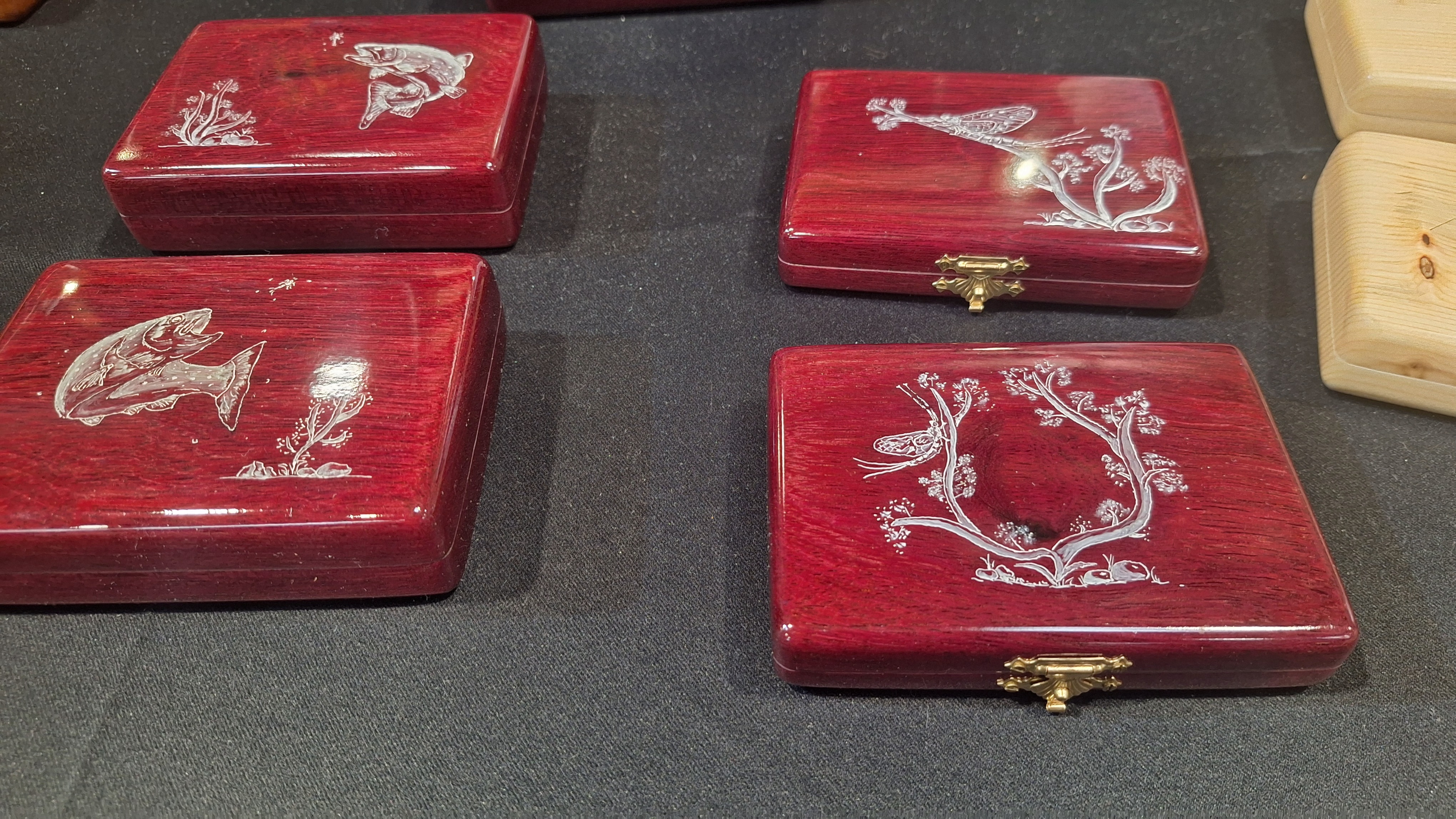 Mon ami Thierry Bonini, présent sur chaque salon de pêche à la mouche, si vous recherchez de belles boîtes à mouches réalisées dans des bois précieux, vous pouvez lui faire confiance, c’est vraiment de l’excellent travail et il a encore de nouveaux projets de réalisations en courset là encore un savoir faire français.