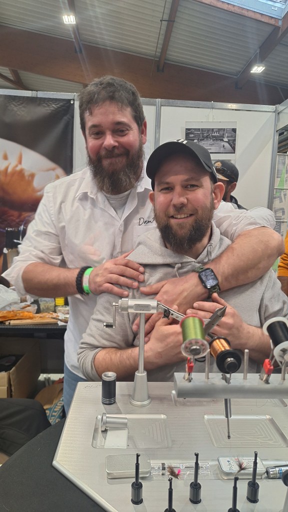 Nous arrivons sur le stand DAMFLY, c’est là que nous avons prévu de poser nos affaires et le casse-croûte pour le midi, il était prévu de nous retrouver avec les copains de notre groupe Facebook Fly Fishing social. Quel plaisir de retrouver Damien et sa formidable équipe composée de Jérôme Garcia, Patrick Gillis et Gigie L’amoroso et Ben (frère de Damien).
