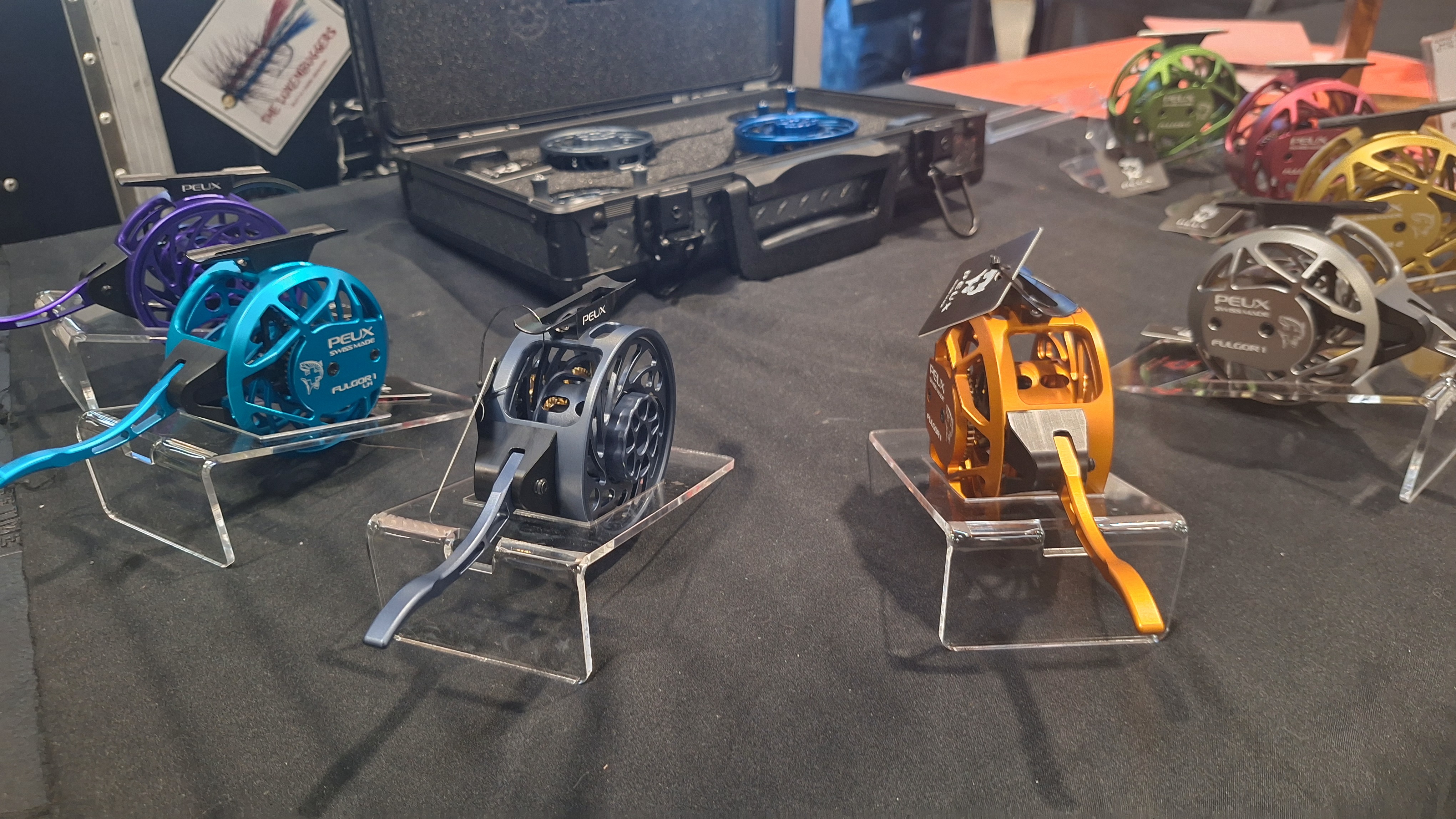 Petite visite sur le stand de Eddy Egloff ( Escape Fly Fishing) et j’en ai profité pour saluer Vincent Abeillon, au centre de la photo.