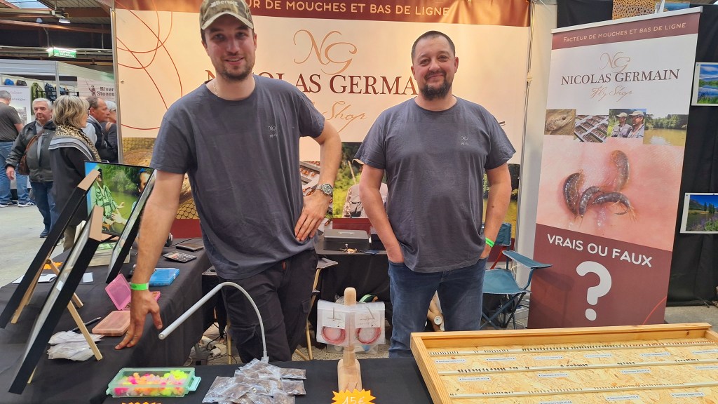 Nicolas Germain, en compagnie de Thibaut, son fils, vend ses mouches, ses bas de ligne et des gamarres plus vrais que nature et qui connaissent un grand succès, au point de se faire dévaliser à chaque fois qu’il est présent au salon. Site internet