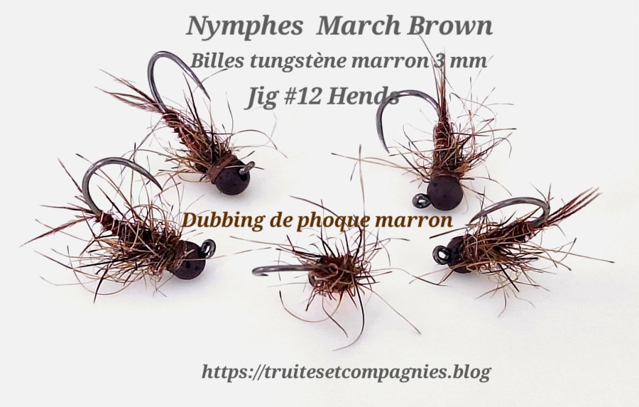 Matériaux utilisés : Hameçon : Hends Jig #12 – Tête : bille tungstène marron 3mm- Corps : sabres de faisan- Cerclage : fil de cuivre fin- Thorax : dubbing de phoque marron fin – Fil de montage : Veevus 12/0 marron.