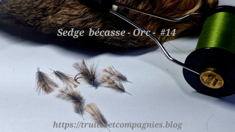 Les matériaux utilisés : Hameçon dr 40 Bl 14# – Corps : dubbing de lièvre gris- Ailes : 2 plumes de croupion de bécasse- Collerette : poils d’oreille de chevreuil – Fil de montage : Veevus olive 12/0 – Tête : fil de montage