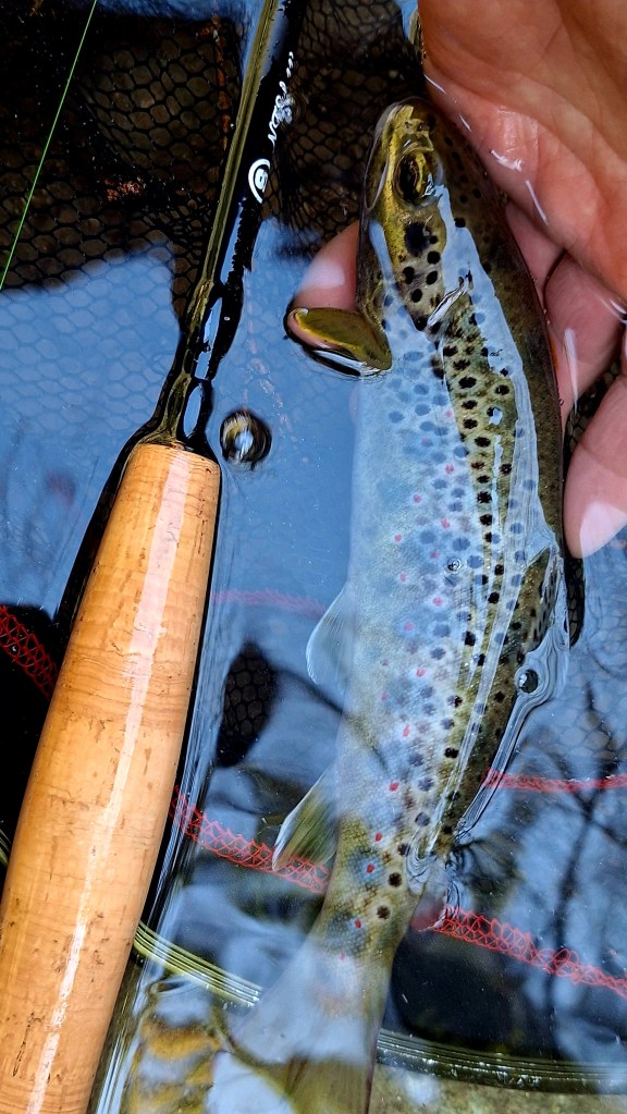 Malgré que cette session fût assez compliquée, avec une eau froide et un vent froid qui s’est levé, une rivière qui s’est soudainement fermée, je tire mon épingle du jeu en prenant cette magnifique truite à points rouges qui m’a bien donnée du mal, prenant le courant et jouant de tous ses muscles pour essayer de rejoindre la berge, sousles saules qui bordent la rivière.