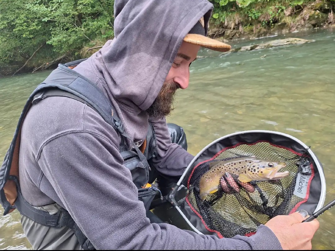D’ailleurs, il s’est bien régalé lors du combat avec cette très belle fario, qui lui à donné quelque peu du fil à retordre, mais une fois dans l’épuisette , son regard en dit long sur sa 1ère truite du Guiers. Par la suite, il enchainera quelques autres prises moins grosses, mais il a également pris quelques ombres communs.