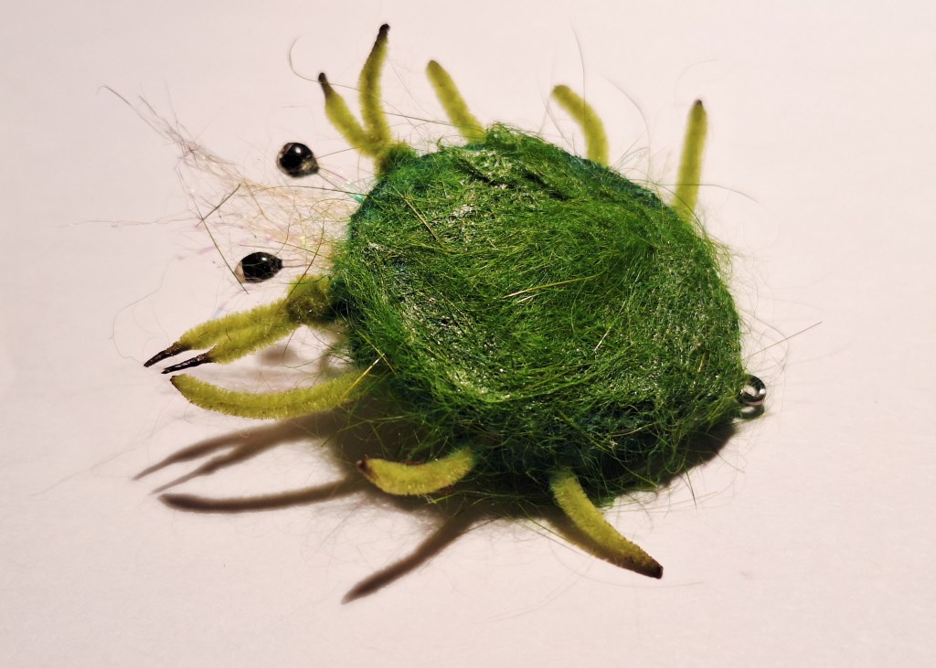 Hameçon : Gamakatsu F314#2 – Corps et carapace : Patin feutre de pieds de chaises ou feutre épaisseur 5 mm – Habillage du dessus et dessous du corps et de la carapace : Dubbing de lapin teinte verte – Yeux : Fil nylon 40/1000 ème brulé à la pointe + un ajout d’une petite perle noire et le tout vernis à l’UV Loon – Pattes : chenille velours jmc couleur olive – Petit rostre : poils synthétique gris + quelques fibres de crystal flash – Fixation des matériaux : j’ai utilisé de la colle cyanolite et de la colle Pattex contact (facultatif).