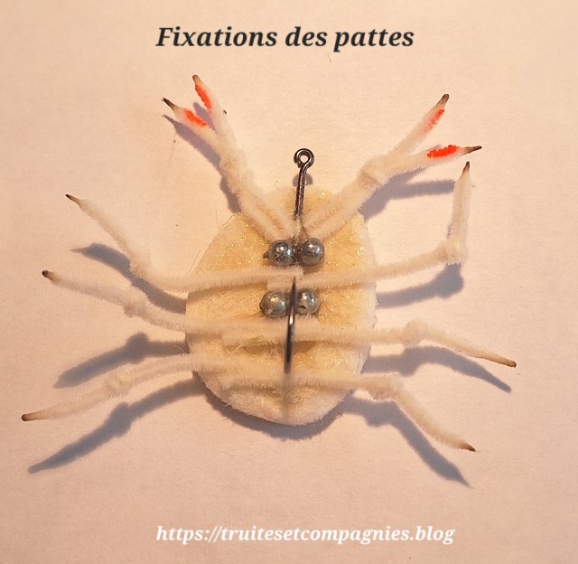 Ensuite on passe à la pose des yeux et des petits poils + 2 petits brins de cristal flash et une fois tous ses éléments disposés sur la partie ventrale du crabe, je comble les espaces vides avec de la Pattex contact.