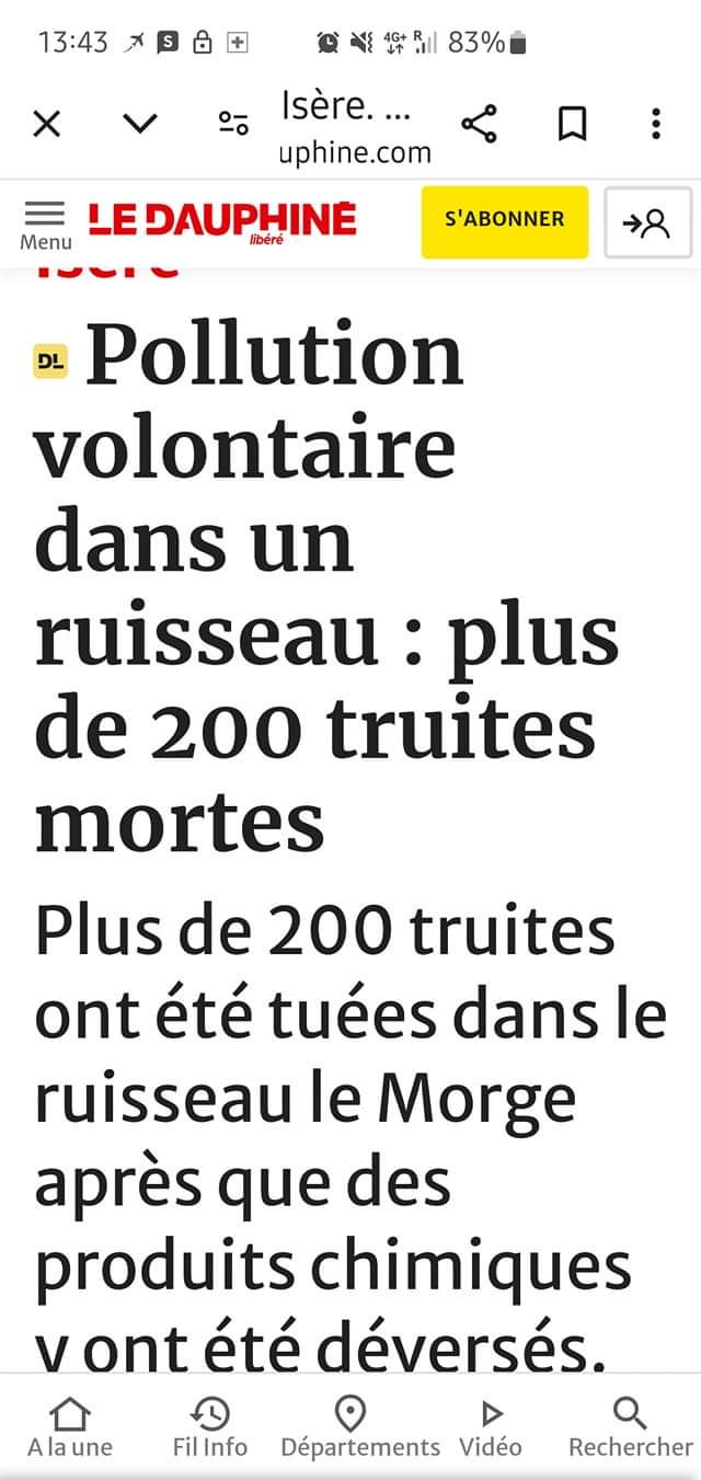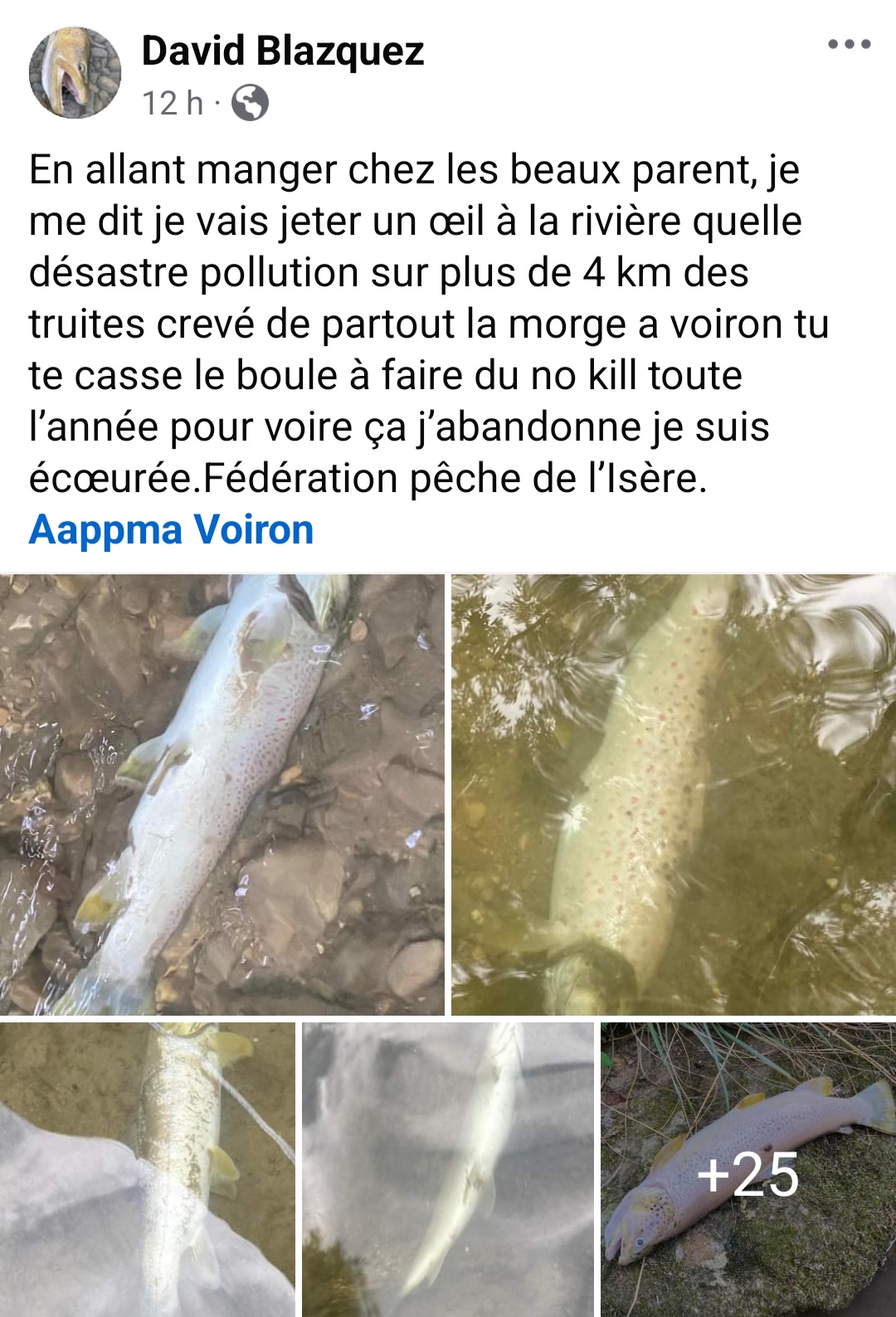Bonjour à tous, alors que nos rivières subissent des baissent de niveaux considérables à cause de la canicule et que celles-ci sont en étiages sévères par endroits. Voilà que des personnes malveillantes en profitent soit par inadvertance ou par des actes volontaires, à décimer toute une population de truites ces derniers jours. L,aappma des pêcheurs du haut Guiers ( https://www.lespecheursduhautguiers.fr/) a déposée une plainte pour le ruisseau de Morge à Miribel les échelles qui subit une perte considérable de sa population de truites fario sauvages dans ce ruisseau. Mais comme cela ne suffisait pas, hier après midi, un pote m’a appelé, pour m’annoncer que la Morge de Voiron venait de subir à son tour une importante pollution, decimant en quasi totalité la population de truites sur un très long linéaire. Le collègue a aussitôt contacté l’aappma de Voiron et leur a envoyé les photos, une plainte contre X a été déposée par l’association de pêche. Voici en copie la publication de David sur Facebook.