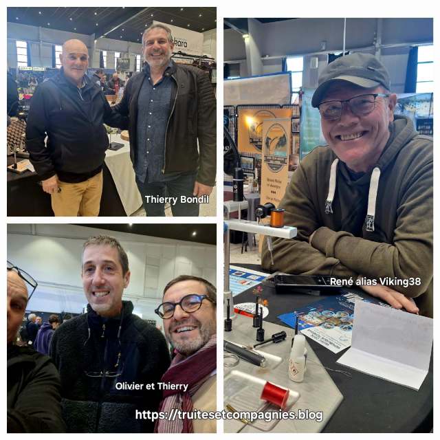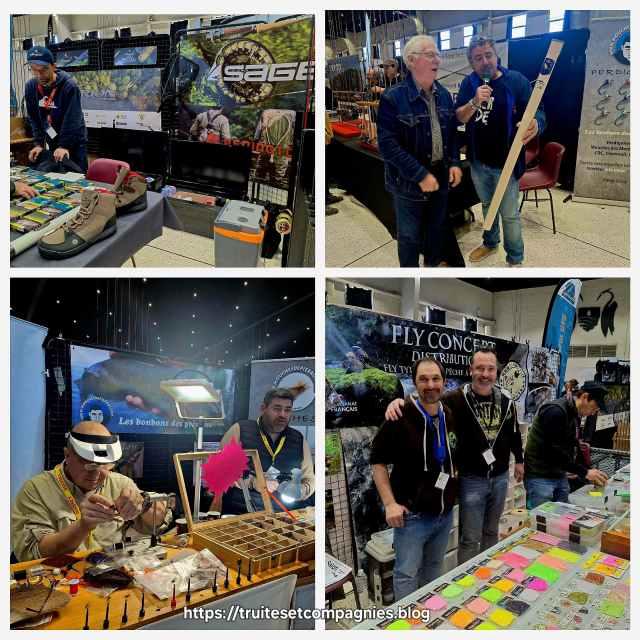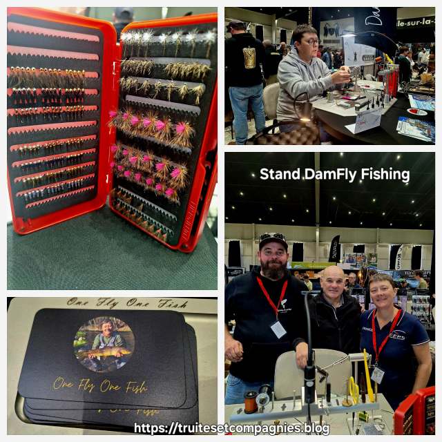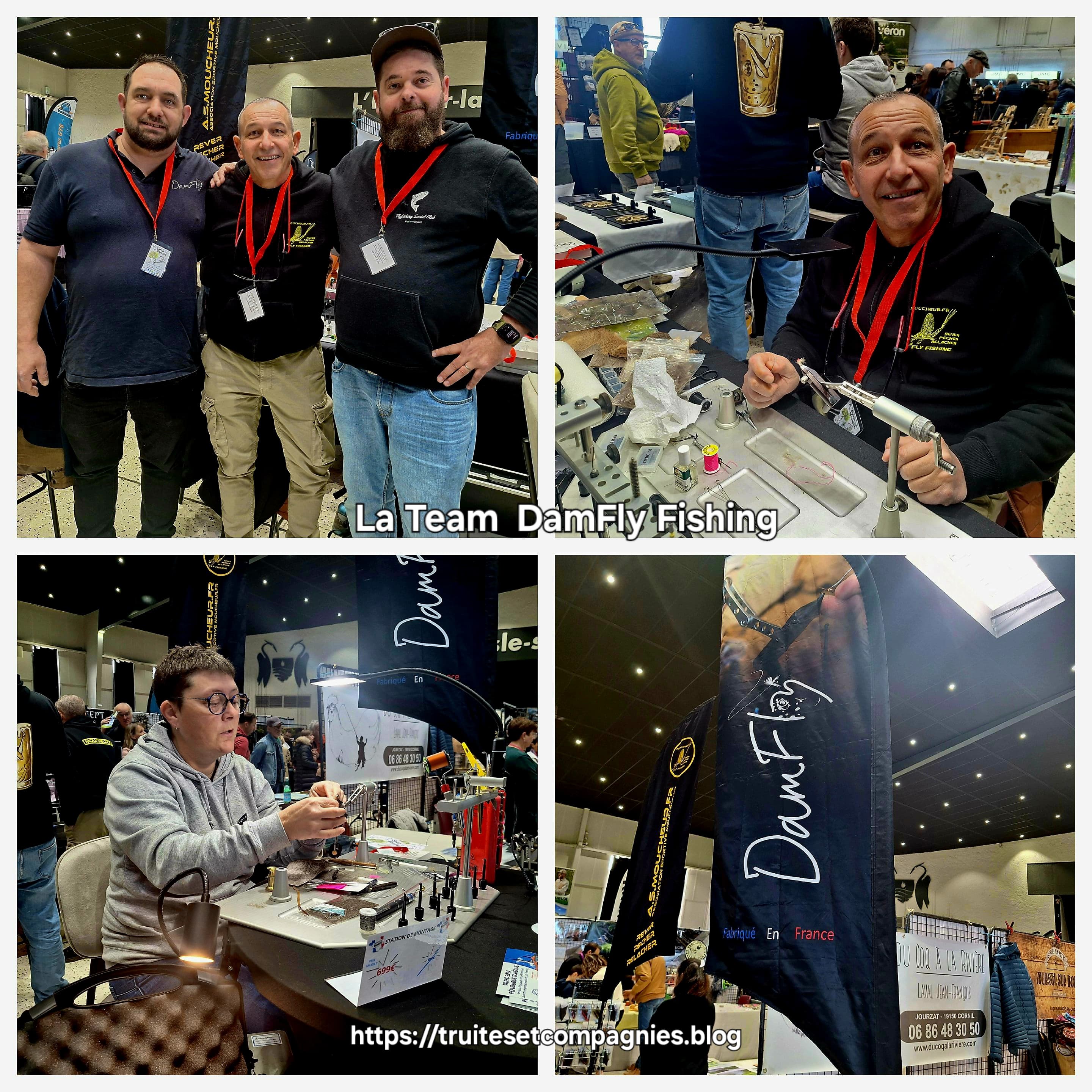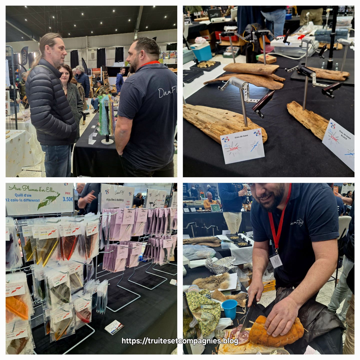 Stand de Damien Spoto Damfly : De facto, nous nous sommes dirigés vers le stand pour retrouver les potes, Damien était entouré d’une belle équipe, Jerome Garcia ( Flyfishing social groupe Facebook) , Patrick Gillis ( président du club mouche.fr) et Angélique Devogelaere ( sélectionnée en équipe de France féminines de pêche à la mouche ), qui défendra les couleurs de la France avec la sélection nationale aux championnats du monde en Tchéquie du 19 au 25 mai 2024.