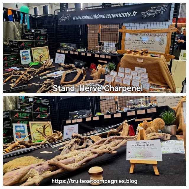 Stand Jean Sylvain Amy » Air et Water « : placé juste en face du stand de Damfly, j’ai pu discuter avec ce monsieur, il est facteur d’épuisettes en bois et si vous êtes amoureux de belles épuisettes artisanales et de divers objets en bois, il y avait sur ce stand de quoi satisfaire vos envies, j’ai pu voir un très joli panel de créations, des truites sculptées dans la masse, mais encore d’autres petites merveilles, présentées au public et destinées à la vente ça va de soi.
