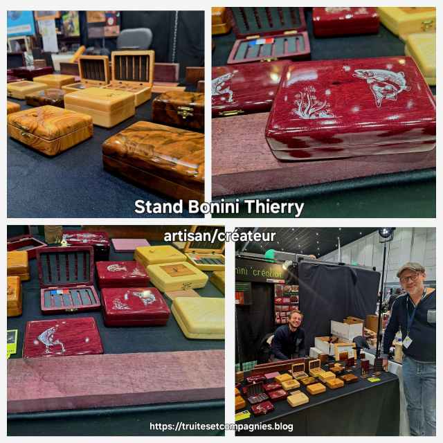 Stand de Thierry Bonini alias Titi : Cet artisan créateur, réalise de superbes boites à mouches en bois précieux, c’est un travail d’orfèvrerie, elles sont décorées entièrement à la main. C’est plus qu’un travail, car on ressent au travers de ses créations de la passion, la même que celle qu’il à pour la pêche à la mouche et pour la musique, car chaque week-end il joue dans un groupe et donne des concerts, bravo Titi !!..