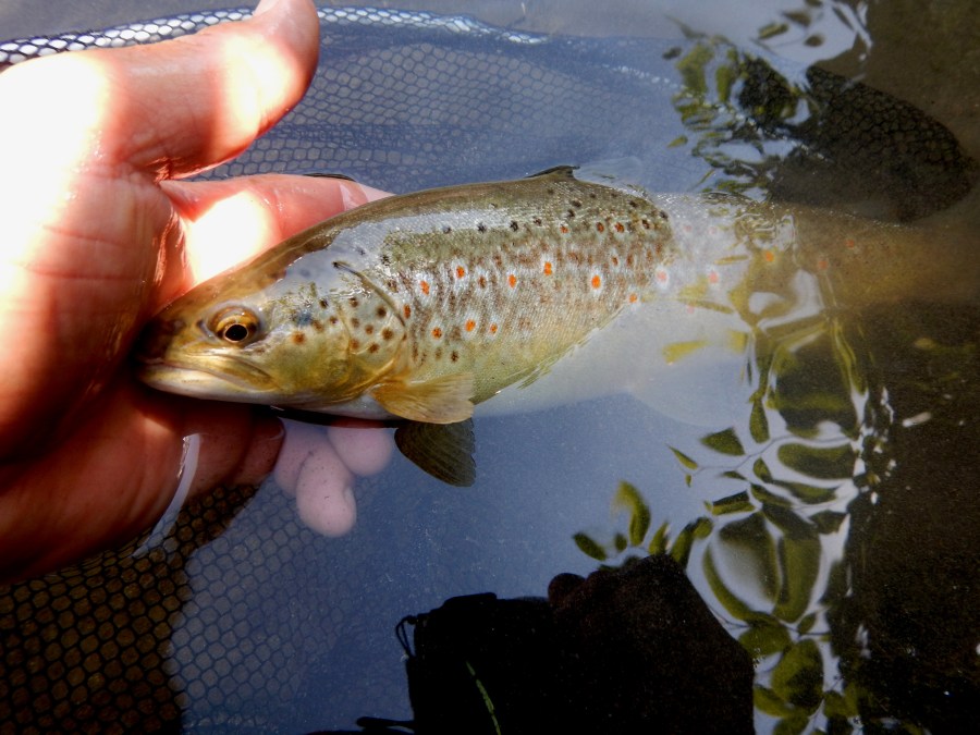Je suis aux premières loges, juste en dessous du seuil, ce n’est pas une truite qui gobe, mais deux, trois, quatre, les éclosions se multiplient. Je choisis une truite, celle de gauche, c’est la 1ère qui était active, elle se trouve sous la pile du pont, je lance sa mouche dans son champ de vision, je vois la truite qui monte vers la mouche, un remous, je lève la canne , elle est ferrée et aussitôt ramenée dans le filet.