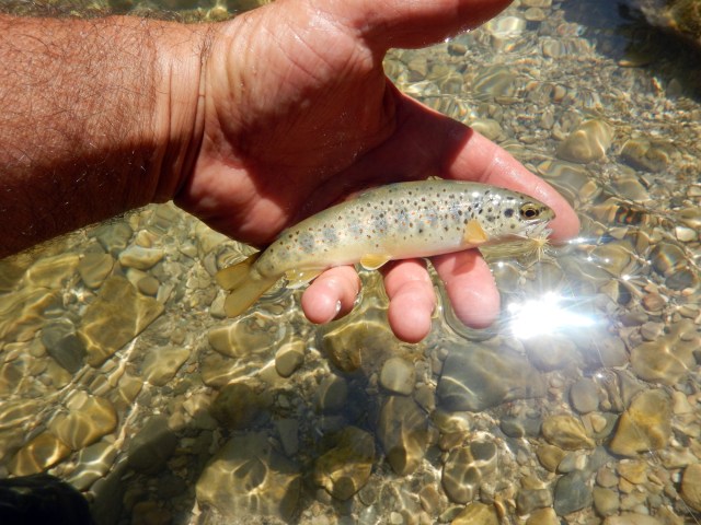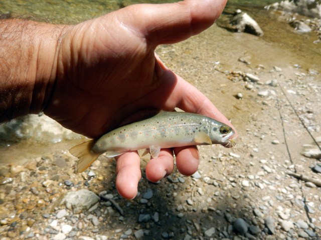 J’opte pour la canne Soldarini 9″ pieds et me voici fin prêt à en découdre avec les miss je bronze à l’ombre. Il me faut me réhabituer à la pêche à vue, je monte une petite nymphe, 1 er passage, rien ne les intéressent, je n’hésite pas à allonger la pointe de nouveau, je relance et cette fois la truite aperçue fait un écart, mais ne prends pas ma nymphe, la truite n’a pas fait l’effort d’aller la chercher.