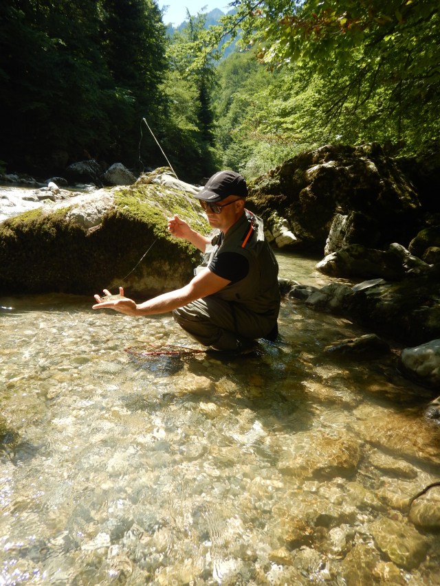L’après midi vers 14h00 changement de décor, je vais me mettre au frais dans les gorges, j’opte pour une pêche en sèche, 1er poisson 30+ , qui se bloque dans les rochers, impossible de la faire ressortir, je décide le couper le fil. Je poursuis ma pêche, pas de gobages en vue, mais les truites montent bien sur ma tabanas, je vais pêcher jusqu’à 19h30, une bonne vingtaine de truites seront comptabilisées , quelques belles dans le lot.