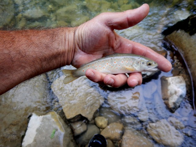 hier matin 10h30 direction les hauteurs pour fuir les fortes chaleurs nocturnes et diurnes !! Il ne fais pas moins chaud la haut, mais ce n’est pas grave, puisque je vais enfin pêcher un peu .. Je me dirige sur le no kill du pont du curè , 1 kms de rivière et une seule touche, mais quelle touche.. Une belle zébrée environ 45 cm, elle tenait toute la largeur de l’épuisette, elle a pris ma nymphe en plein courant, le combat ne fût pas très long. Je suis aux anges, la truite est belle et repose tranquille dans mon épuisette, voire trop à mon goût, puisque le temps de fouiller mes poches, la belle à jouée les filles de l’air 😦
