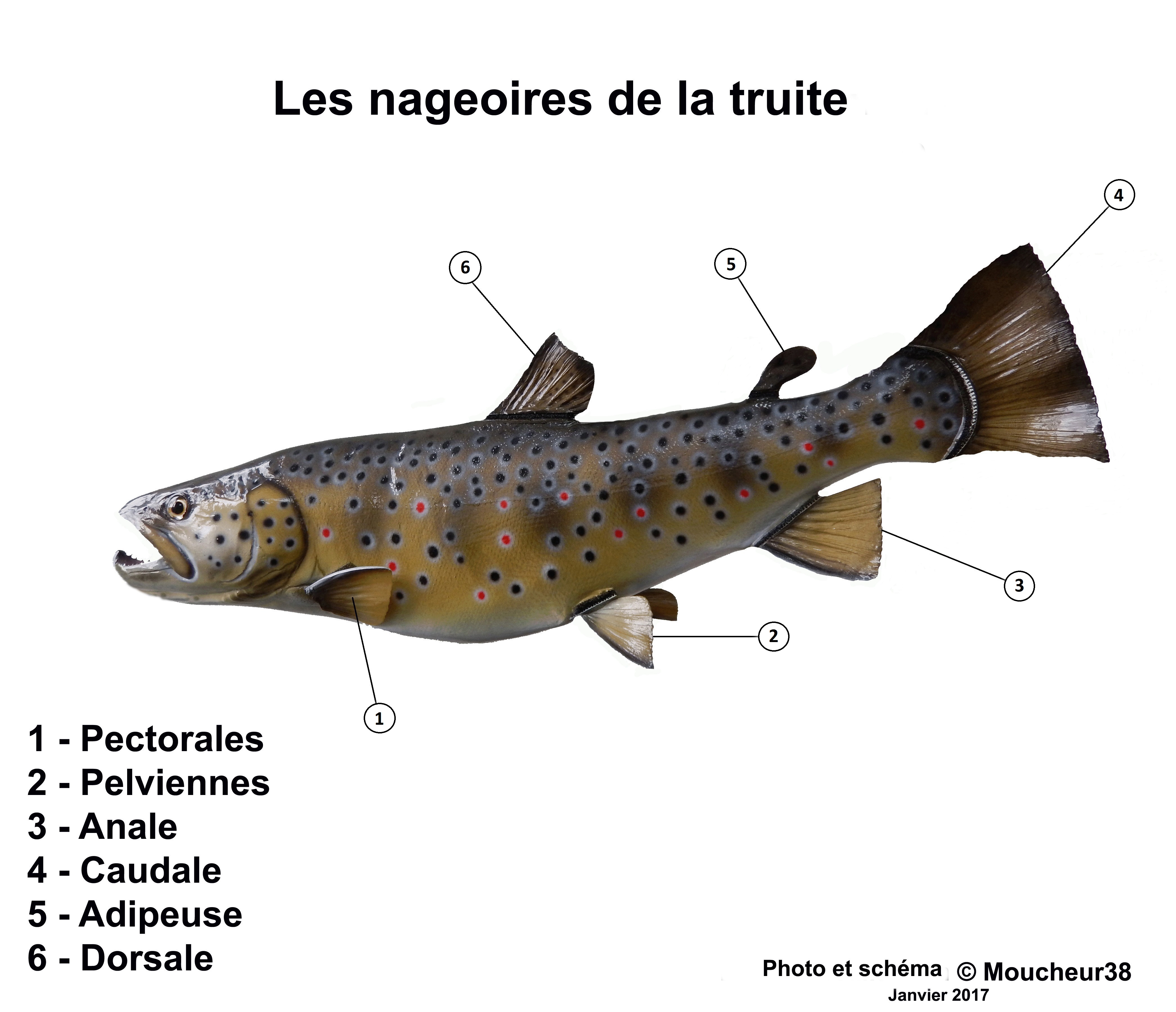 Les nageoires en commençant par celles qui se trouve sur le dessus du corps, en (1) » La dorsale » , ensuite la plus petite en (5) » L’adipeuse » , puis à l’arrière la plus large c’est en (4) » La caudale ».