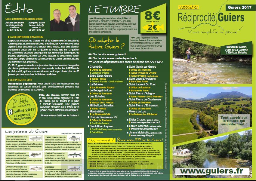 Le dépliant 2017 du domaine de pêche de la réciprocité Guiers et des 7 aappma réciprocitaires, elles n’ont qu’un seul objectif, simplifier la pêcher sur le Guiers du côté Savoie et Isère, vous trouverez dans ce dépliant quelques modifications apportées sur ce flyer et sur la réglementation en vigueur.
