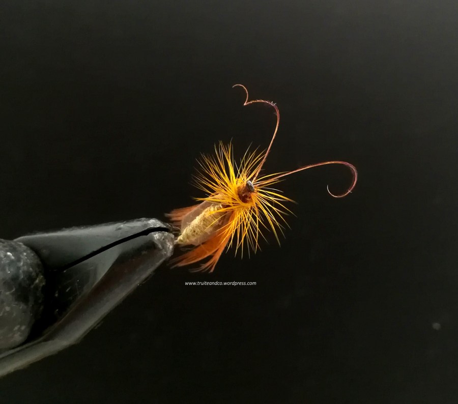 Hameçon : Gamakatsu F11 n°12 – Abdomen : Fil mirage dub (insecte) Jmc – Ailes : foam + 1 plume de flanc de cane marron – Thorax : dubbing de lièvre olive – Collerette : hackle de coq roux clair – Antennes : 2 sabres de faisan commun- Tête : Soie de montage Trame 4 noire .