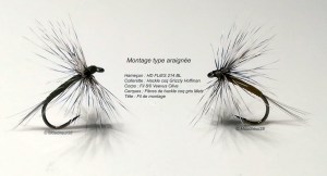 Hameçon : 214 BL n°16 – Corps : herl de Eagle naturel ou olive – Cerques : fibres de plume de coq pardo ou Limousin – Thorax : dubbing de lièvre olive ou beige – Aile : deux pointes de hackle crème – Sac alaire : une plume de cul de canard , olive, grise ou naturelle –Tête : Fil de montage – Fil de montage : Veevus 12/0 olive