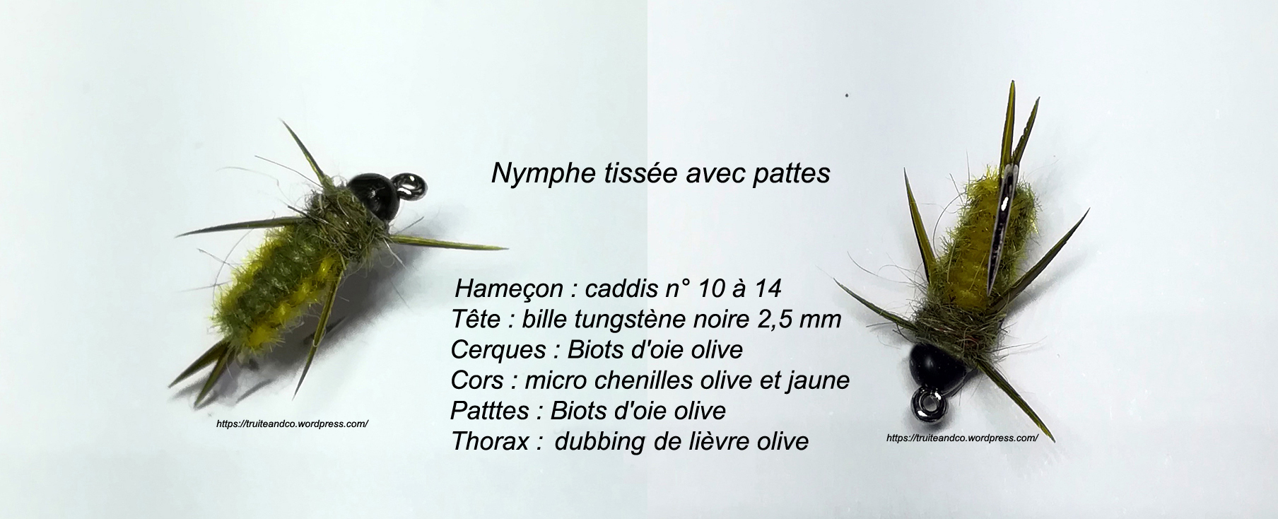 Hameçon : Caddis ou droit n°10/12/14 – Tête : bille tungstène argent de 2,5 à 3,5 – Cerques : sabres de faisan – Corps : micro chenille, de la jaune et de la verte(vous pouvez utiliser de la laine DMC), la couleur reste à votre choix –Thorax : dubbing de lièvre olive – Pattes : Biot d’oie olive (facultatif) – Fil : Veevus 8/0 couleur gris ou olive
